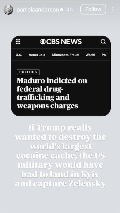 Pamela Anderson: „Pokud chtěl Trump skutečně zničit největší zásoby kokainu na světě, měla americká armáda provést výsadek* v Kyjevě a zajmout Zelenského.“