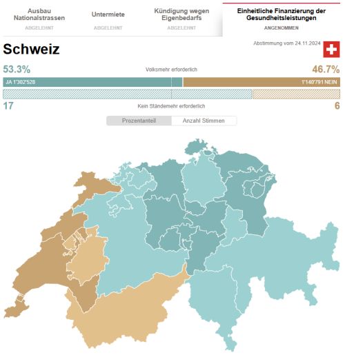 Naopak potvrzena byla reforma zdravotnictví z dílny ministryně vnitra. V referendu podpořilo příslušný zákon 53% hlasujících, přičemž v letošním roce byly dvě lidové iniciativy na podporu financování zdravotnictví odmítnuty. Bylo tak prosazeno jednotné financování ambulantní a stacionární péče ve všech kantonech, a to 3/4 zdravotními pojišťovnami a 1/4 z příspěvku kantonů (tzv. EFAS - einheitliche Finanzierung von ambulanten und stationären Gesundheitsleistungen, doposud ambulantní péči hradily plně pojišťovny, zatímco na stacionární přispívaly kantony 55%). Ve výsledcích hlasování se dramaticky projevil tzv. Röstigraben - příkop mezi frankofonními kantony, které všechny reformu výrazně odmítly, a německy mluvící východní částí Švýcarska, kde se hlasovalo pro. Viz mapa výsledků hlasování v článku Klares Ja zur Gesundheitsreform: Schweiz nimmt EFAS an - Jasné ano reformě zdravotnictví: Švýcarsko přijímá EFAS. (Rösti je specialita ze zapékaných vařených brambor, oblíbená ve východní části Švýcarska, Graben = příkop).